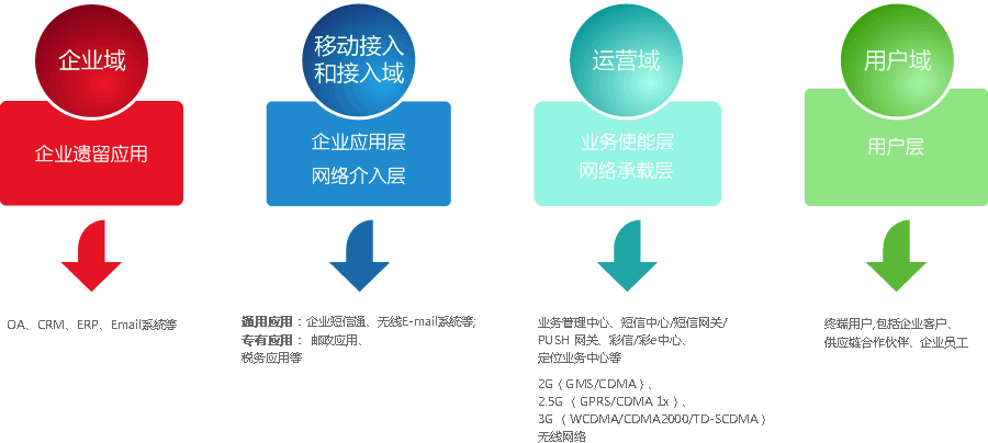 整个框架包括企业域、移动应用和接入域、运营域和用户域四个部分。其中,企业域主要是企业的各类现有应用,包括邮政、地税等行业专用系统;移动应用和接入域是企业各类应用向无线方面扩展的域,提供通用应用和专有应用;运营域则是各运营商的网络部分;用户域则是用户的移动终端。