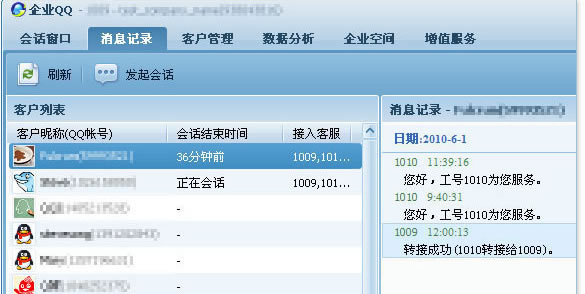 当客户咨询时,处于当前会话中的员工如果无法解决或者觉得由另一位员工更能为该客户服务,则可随时使用“客户转接”功能,可以很方便的由一个工号转到的另一个工号为此客户服务。